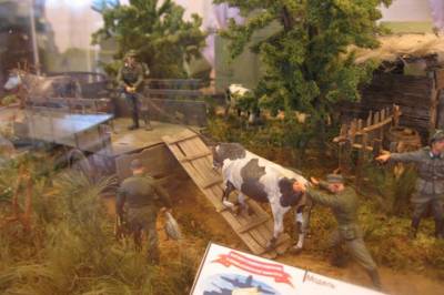 А вот другие солдаты пытаются затолкать корову в кузов грузовика.