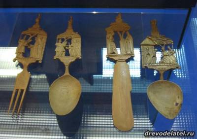 Невероятно изящной работы резные деревянные ложки, в ручках которых вырезаны сценки из жития святого Сергия Радонежского.