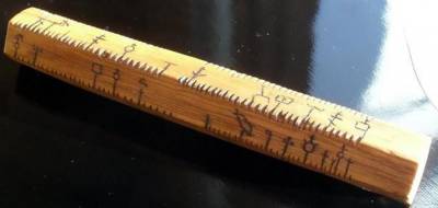 С первого взгляда было заметно, что это вещь старинная. Сначала я принял его за аршин собственной крестьянской меры, или за известные крестьянские рубежи (бирки), которые постоянно служат им, по безграмотству, вместо всяких счётных книг; но я ошибся: на бруске были нарезаны не палочки, и не крестики, заменяющие цифры, а какие-то совсем другого рода фигуры, похожие на иероглифы.