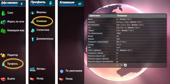 В «Trackmania» действия на клавиши геймпада можно назначить в соответствующем меню, перейдя в него по ссылкам «Профиль» - «Клавиши». Пусть вас не смущает то, что в строке команды написана не та кнопка – просто при назначении действия нажимайте нужную кнопку.