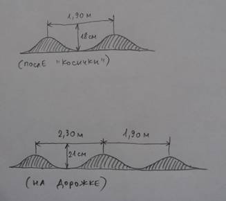 Для моего байка (26-тые колёса, база, то бишь расстояние между точками соприкосновения с землей колёс, - 110 см) идеальные для памп-трека кочки получились после «косички» - они проезжаются даже практически на нулевой скорости путем «прокачивания» байка. Размеры смотрите на рисунке выше.