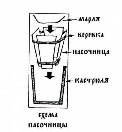 Делать это следует добросовестно, плотно прижимая творожную массу, утрамбовывая. Когда пасочница будет наполнена до краёв, необходимо накрыть творожную массу краями марлевой салфетки, положить на «сооружение» гнёт и поставить в холодное место, ни в коем случае не переворачивая пасочницу.