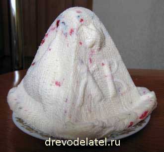 После этого пасочницу надо перевернуть, поставить на вершину (см. схему) и уложить внутрь влажную отжатую марлю, стараясь сделать так, чтобы середина марли оказалась как раз в середине вершины пирамиды и касалась блюда, на котором стоит «вверх ногами» пирамида–пасочница. Марлю надо аккуратно расправить. Теперь можно закладывать пасху.