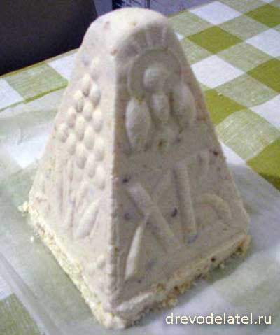 Для того, чтобы уложить приготовленное блюдо в форму, необходимо построить из четырёх деревянных деталей пасочницы четырёхстороннюю пирамиду так, чтобы стороны с резными изображениями оказались внутри. Затем надо перепоясать основания пирамиды верёвкой (она ляжет в уголки–углубления) и завязать её.