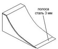 Делается это так: стальную полосу 300 мм шириной и 3 мм толщиной крепите винтами М5 с конусной головкой (под потай) таким образом, чтобы 10-15 см стальной полосы выступало перед началом заезда. Когда трамплин встанет на асфальт, этот свободный край сам изогнётся как надо. Заезд получится плавным и прочным.