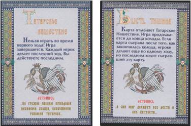 Еще бОльшую привлекательность игре придают карты летописей и событий, которые весьма важны, и которые могут весьма радикально повернуть ход игры, например, в тех же войнах «князь», не сумевший защитить от захвата свой город, может ехидно напакостить вслед, применив карту «Разграбление», которая уничтожает все постройки и стены в отнятом городе (но не стоит торопиться с местью, если на руках есть карта «Митрополичий суд», позволяющая вернуть себе отнятый град), либо отбиться одновременно несколькими картами войск с помощью карты «Мудрый воевода», либо совсем прекратить братоубийственную войну, использовав карту «Митрополичье осуждение».