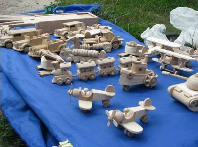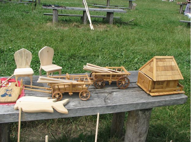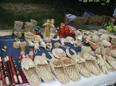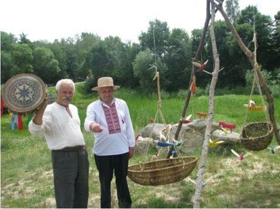 манят к себе чудно расписанные деревянные изделия, вот дедушки зазывают всех покачать плетенную колыбельку, увешанную разноцветными птичками,