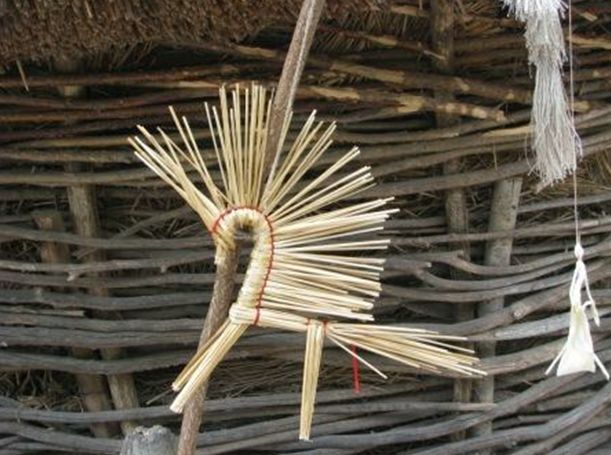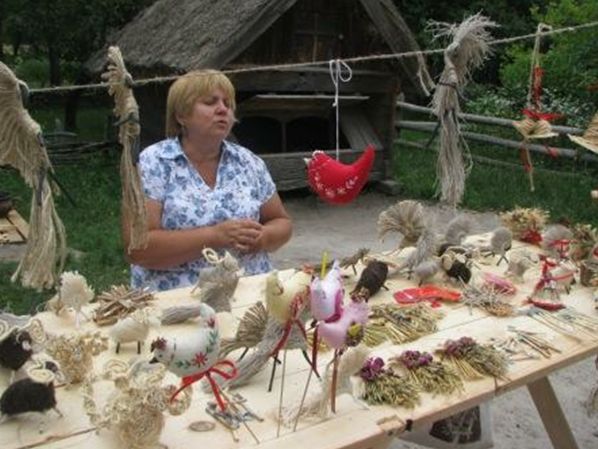 девушка-русалка плетет из соломы причудливых животинок и человечков, рассказывая о символичности каждого изделия, а рядом продается говорящая (клацающая) коза для коляды,