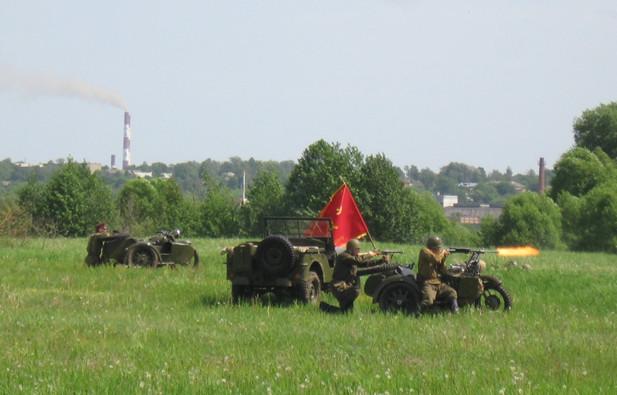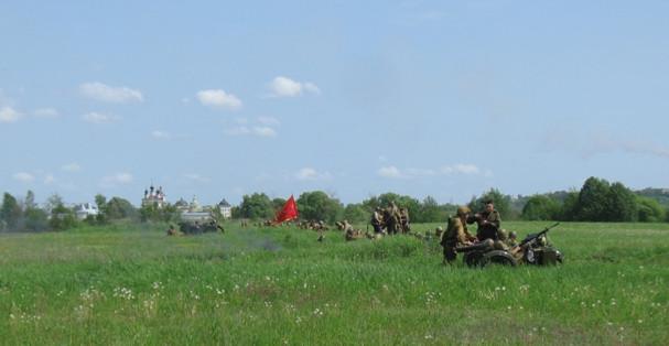 В центре поля, на фоне Белопесоцкого монастыря, окопались «советские солдаты» с двумя мотоциклами, вооружёнными пулемётами.