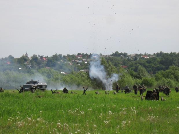 на фоне непрекращающихся пулемётных выстрелов и взрывов нападали «немцы»,