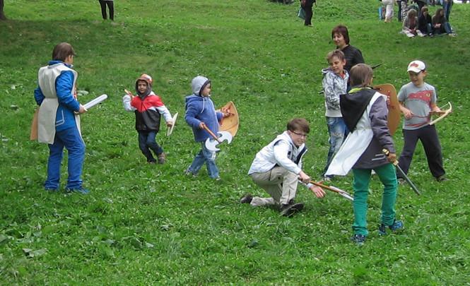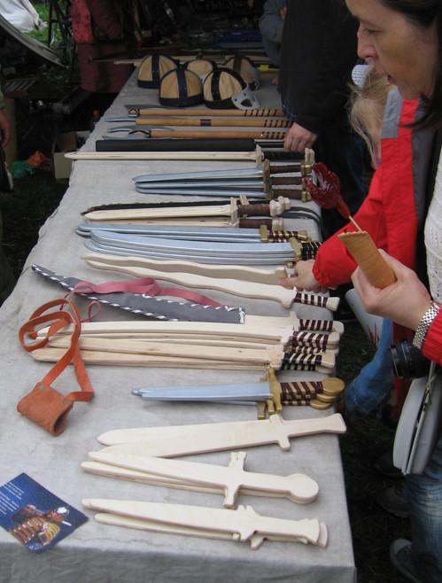Тут же рядом в палаточках продавали фанерные и деревянные мечи, щиты, луки и арбалеты, шлемы и островерхие шапки с перьями,