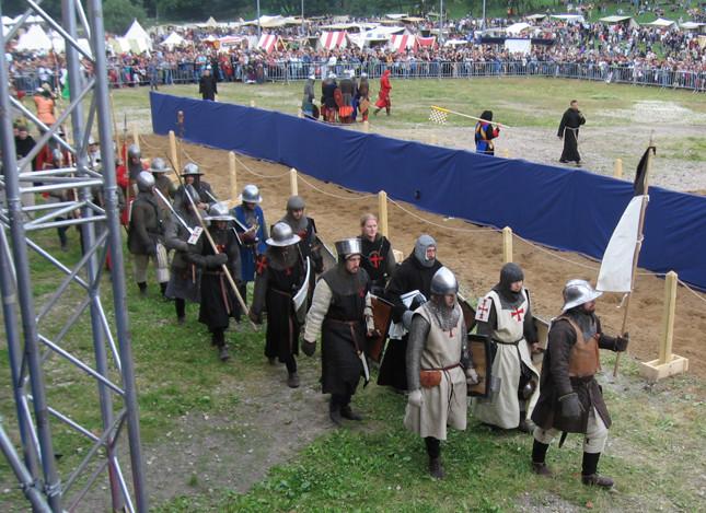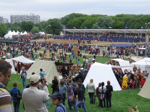 Вдали видно окружённое трибунами ристалище, на котором происходили основные сражения фестиваля, этакие полноценные исторические реконструкции битв. Можно было, купив билет, комфортно расположиться на трибуне, а можно было просто втиснуться в оцепление зрителей вокруг зрелища.