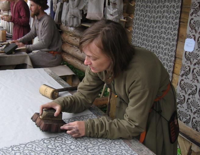 набивка узоров на ткани с помощью деревянного резного штампа;