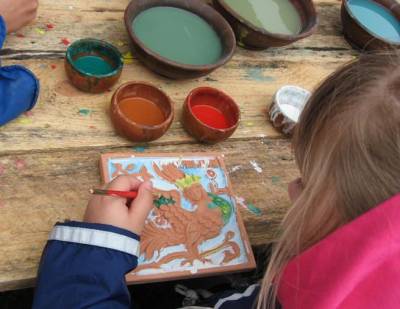 крашение ткани в кипящем растворе дающих цвет веществ, например, ореховых скорлупок; создание глиняных горшков
