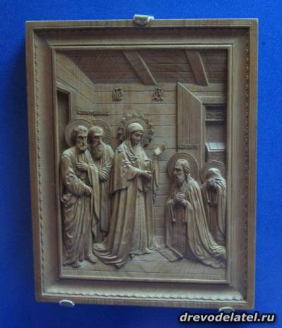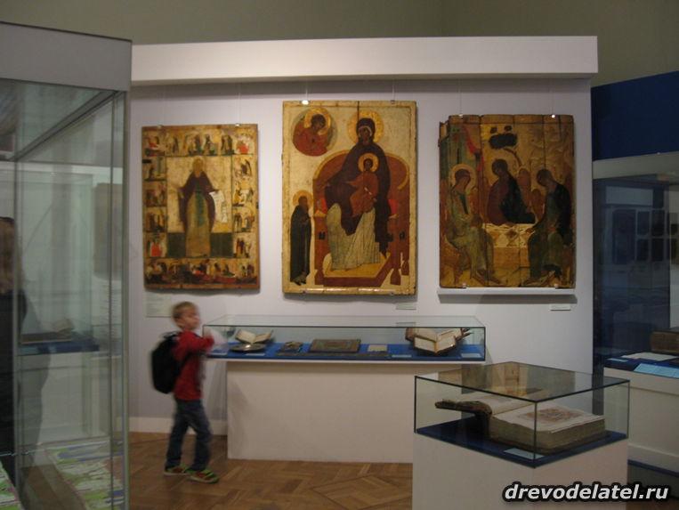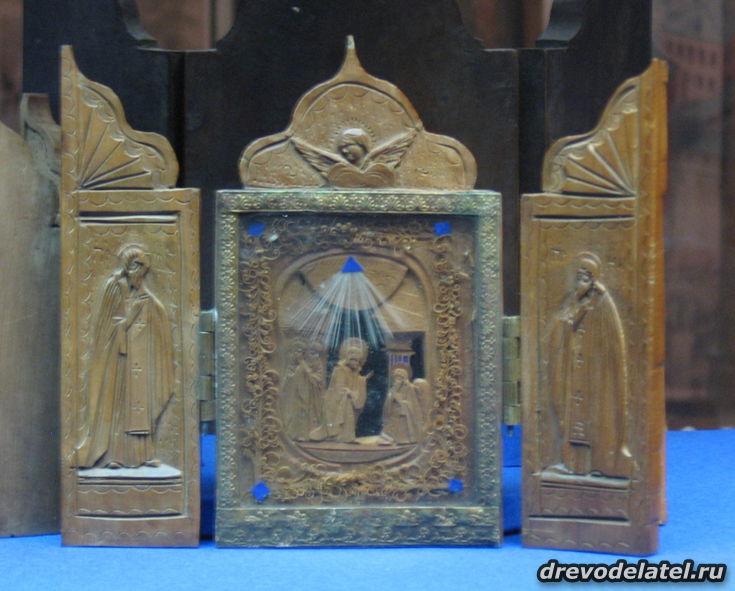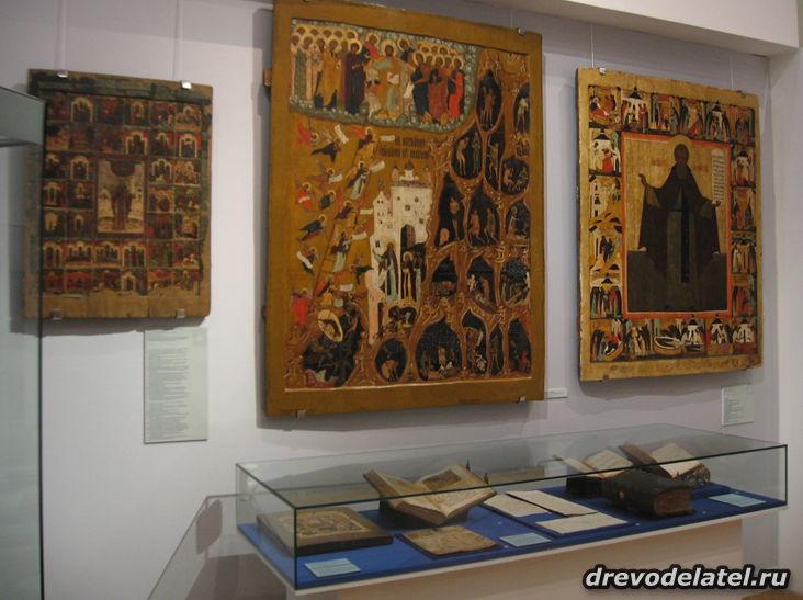 На выставке выставлено множество деревянных резных икон и складней, качество работы которых невероятно искусно и изящно, а в декоре использованы даже такие детали, как стружечки в качестве рамочек и пёрышки в качестве благодатных лучей.