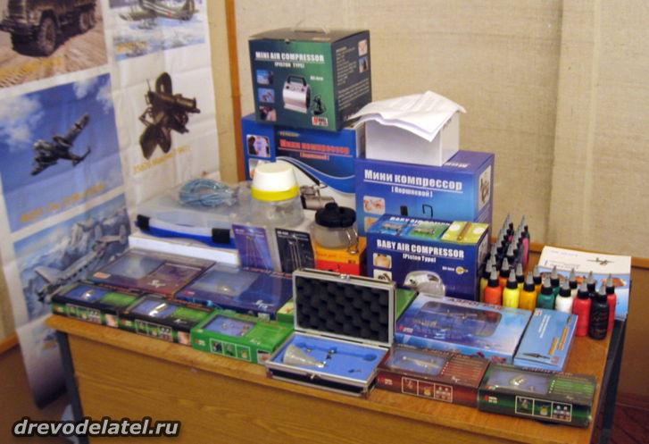 Были выставлены на продажу и компрессоры с аэрографами. Как я узнал, с помощью аэрографа можно окрашивать модели как водными, так и красками на растворителях. Но вот для отделки столярных изделий аэрограф не подойдёт — мебельные лаки слишком густые для модельного аэрографа. Зато этот инструмент будет идеален для тонких работ — росписи, тонировки, раскраски.