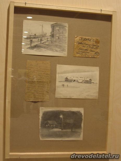 Вверху справа — рисунок, нарисованный свиной кровью (из-за отсутствия нормальных красок и чернил), «Домик рыбака», Карлаг, 1950. Внизу слева — поздравительная телеграмма, Карлаг, 1945. Внизу справа — открытки дочери, Богословлаг, 1946.