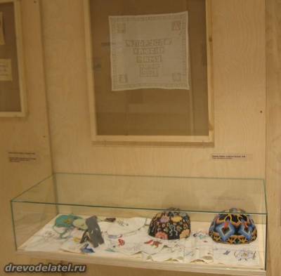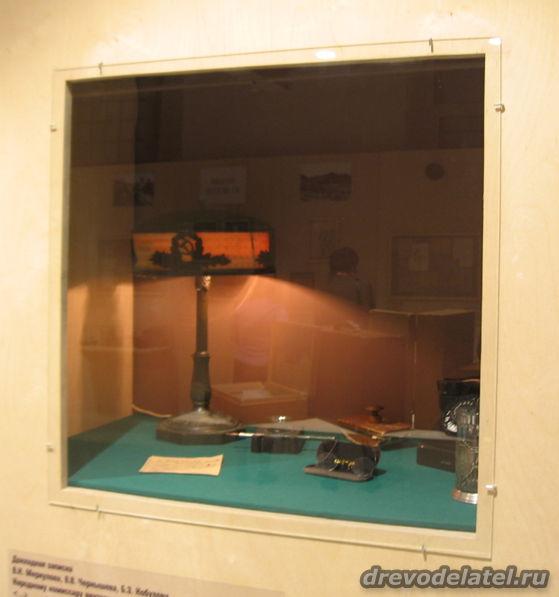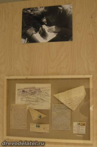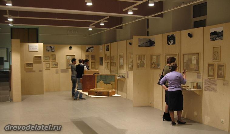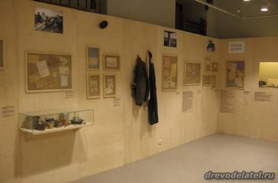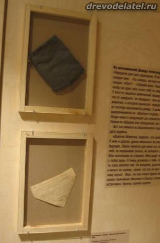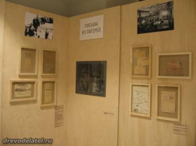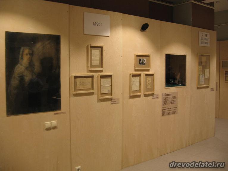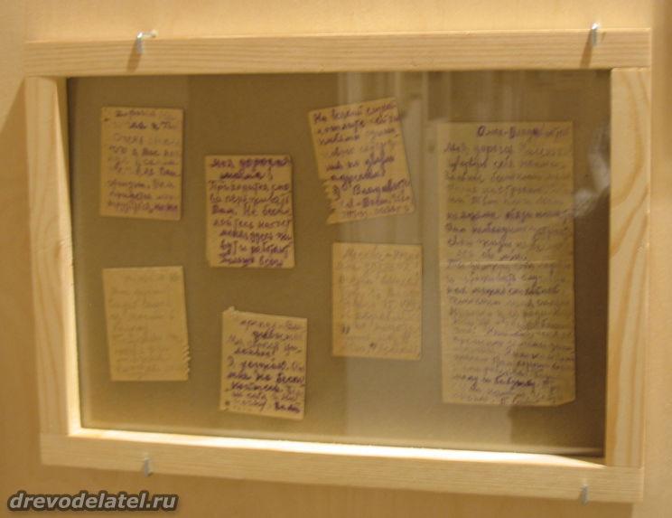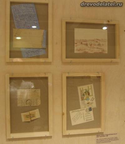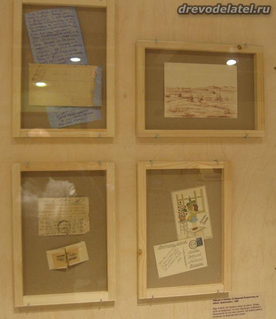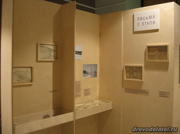 Пространство выставки оформлено в стиле посылок из лагеря — аскетичные стенды из ничем не обработанной фанеры, простые рамки с экспонатами за стеклом.