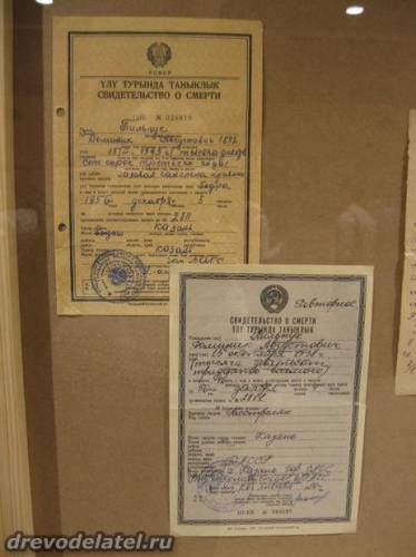 Вверху левее — ответ из справочной НКВД о судьбе осуждённого М.Шика, Москва, 1939. Причиной смерти указана болезнь, газовая гангрена правого бедра. А ниже правее — свидетельство о смерти того же человека, выданное в 1990 г., и здесь уже прямо написано — расстрелян.