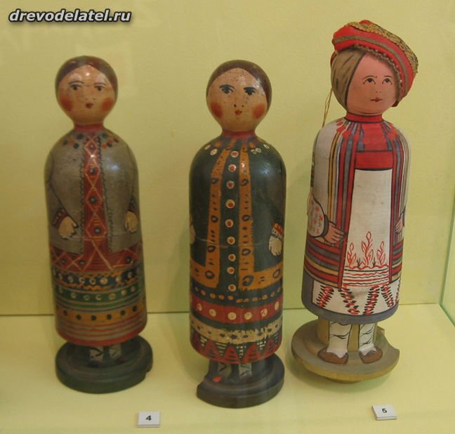 Слева направо: Матрёшка «Женщина с рыбой», Овешков И. И. (?), г. Сергиев, Московская губ., 1920-е гг. Дерево, точение, роспись, лак. ВМДПНИ