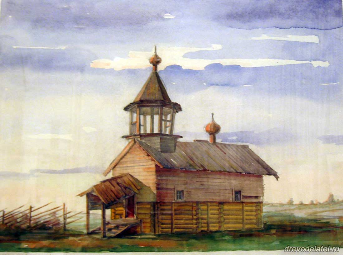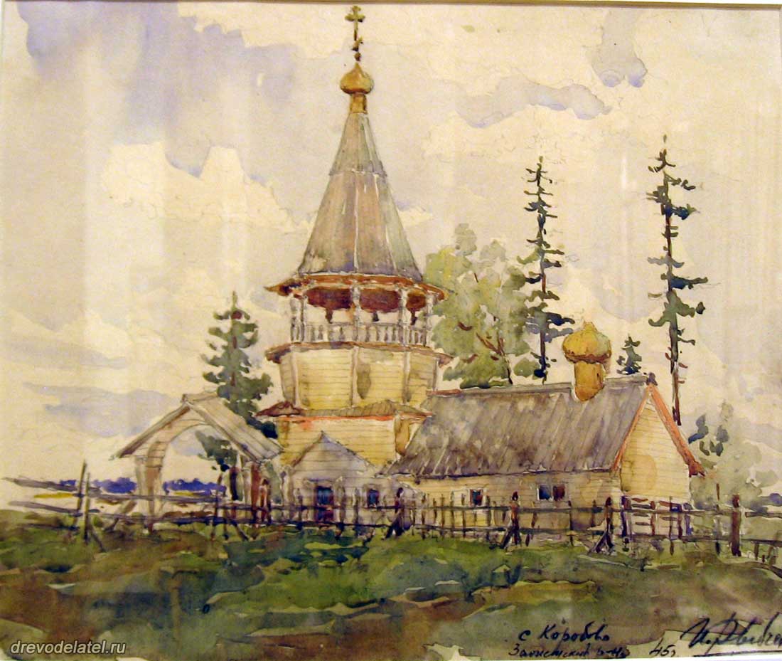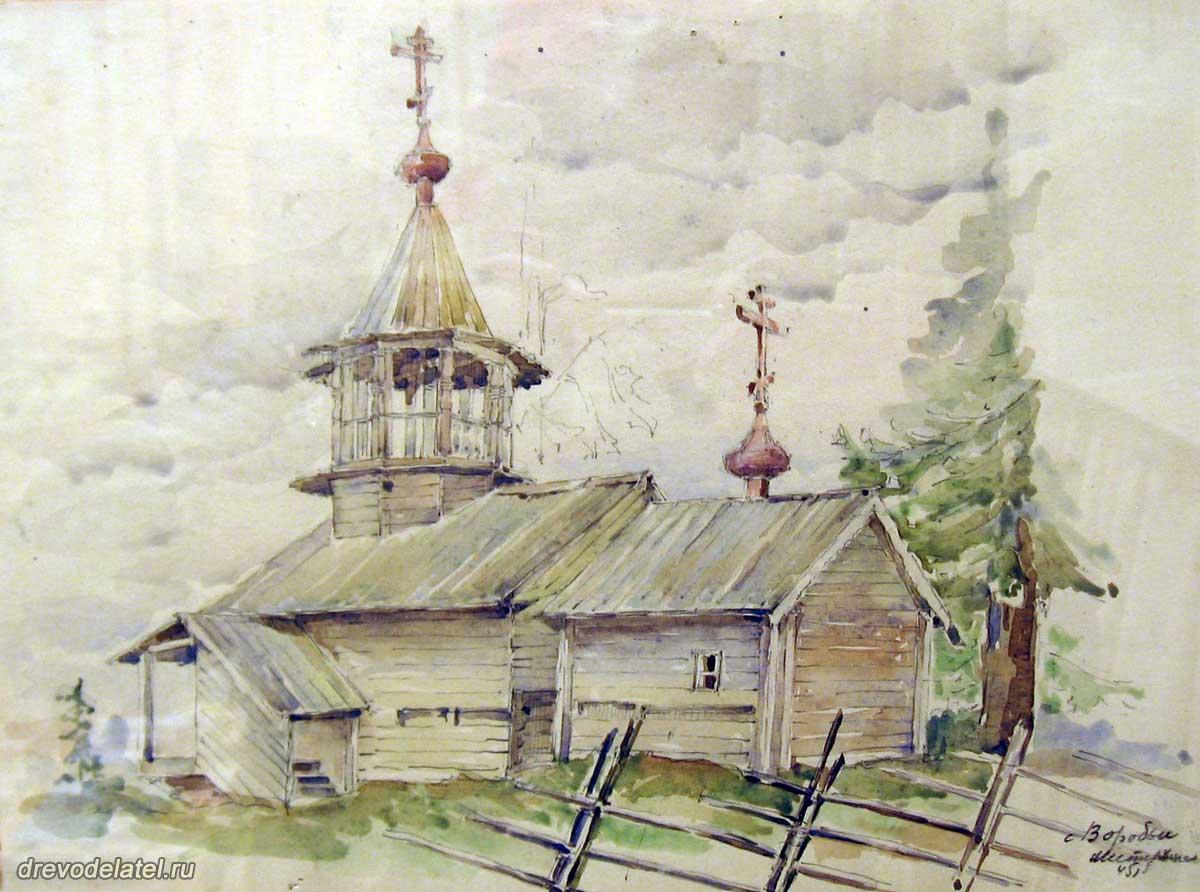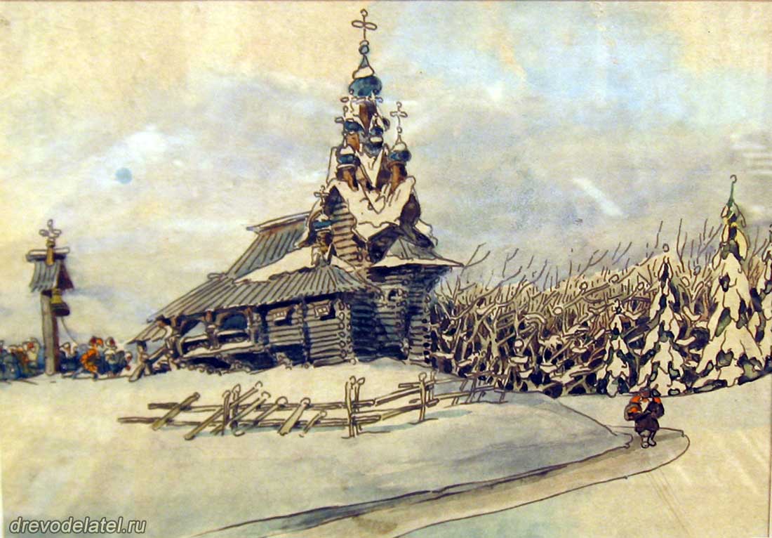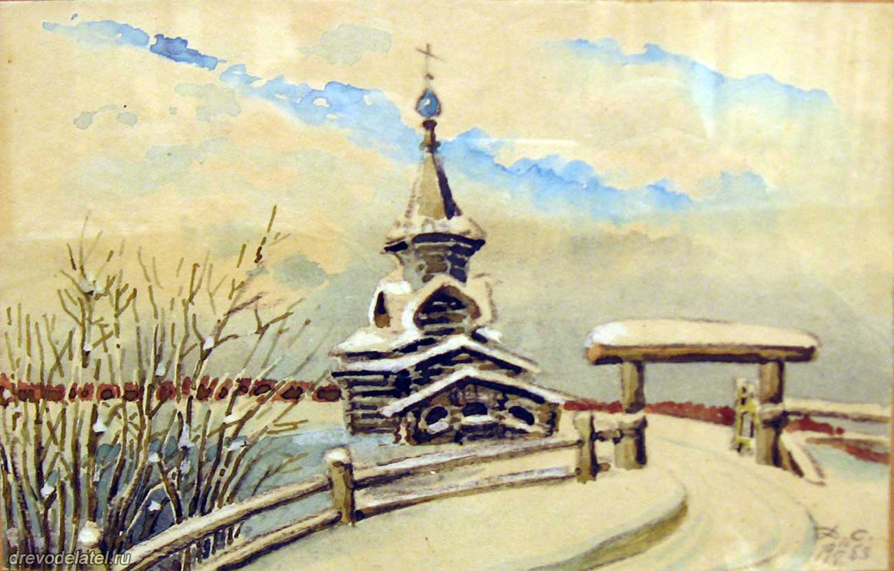 Деревянная шатровая церковь на фоне зимнего пейзажа. 1953