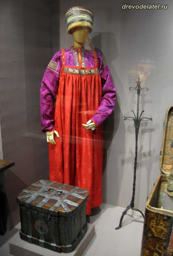 Штоф, льняное полотно, набойка, бусины, пуговицы; ткачество, шитьё.