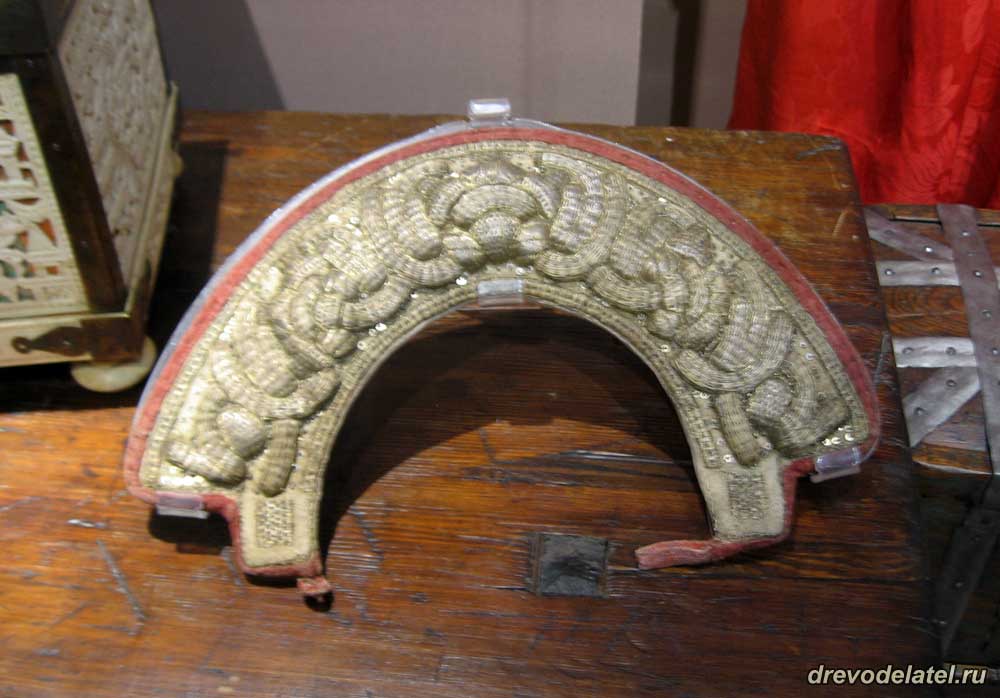 Льняное полотно, золотная серебряная и шерстяная нити, тесьма из шёлка; шитьё, вышивка.