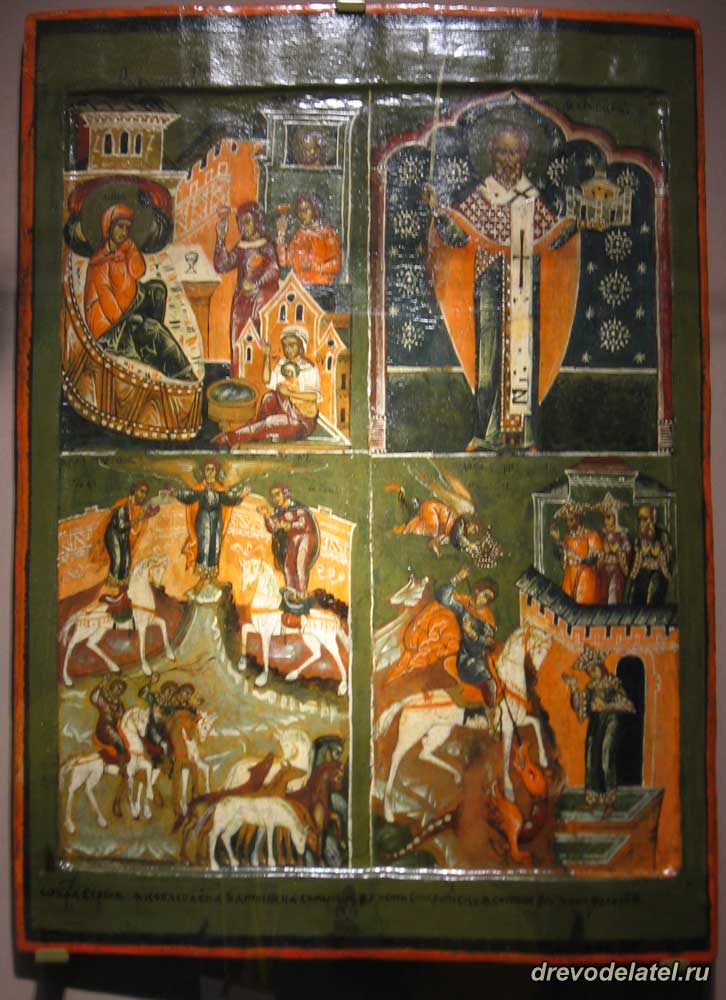 Икона четырехчастная «Рождество Богоматери, Святитель Николай Можайский, Чудо о Флоре и Лавре, Чудо Георгия о змии»