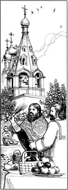С белым узелком яблок пошли к обедне. Всюду эти узелки, как куличи на Пасху, заняли места в доме Божьем: и на ступеньках амвона, и на особых длинных столах, на подоконниках и даже на полу под иконами. Румяно и простодушно лежали они перед Богом, — вошедшие в силу, напитавшись росою, землёю и солнышком, готовые пойти теперь на потребу человека и ждущие только Божьего благословения.
