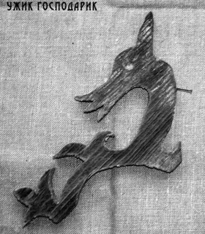 Змея, уж — их изображение происходит из языческого культа ужей-господариков. Обычай держать в домах ужей с глубокой древности известен всем славянам: ужи считались охранителями зерна и дома от мышей. Изображения ужей археологи встречают на многих предметах.