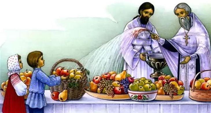 Сообразно с этим, в день 6 августа вся паперть в приходских церквах бывает заставлена столами, на которых навалены горы гороха, картофелю, огурцов, репы, брюквы, ржи, ячменя, яблок и проч. Все эти плоды урожая священник благословляет после обедни и читает над ними молитву, за что благодарные прихожане ссыпают ему в особые корзины так называемые «начатки», т. е. понемногу от каждого сорта принесённых плодов.