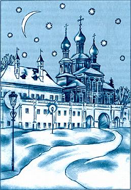 Полетели сани по московским снежным улицам. Развернулось над нами чистое, морозное небо. Засияли звёзды, словно лампады небесные, неугасимые. Встали сани у ворот монастыря Новодевичьего. Забелела каменная ограда. Прошли через кладбище, поднялись по пологой лестнице в зимнюю церковь с низкими сводами.