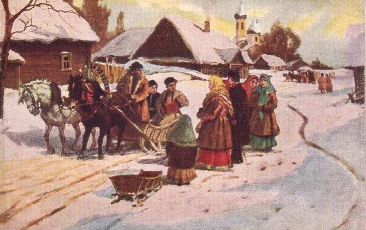 Брак, свадьба, плодородие — мотивы святочных игр, гаданий, подблюдных песен — были тем естественным фоном, на котором разворачивались хлопоты и ожидания, связанные со сватовством, с выдачей замуж девушек и женитьбой парней. Поэтому в севернорусских областях, где население жило в небольших деревеньках, сложился обычай принародных девичьих смотрин.