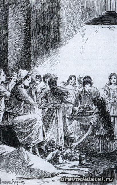Было 7 часов вечера, большой зал был освещён светло и красиво. Его высочество принц Ольденбургский, начальница со своими знакомыми, родные — уже заняли свои места; попарно ввели девиц в казённых платьях, за ними шли костюмированные тоже парами, в порядке надетых национальных костюмов. Когда все заняли свои места, начались танцы.