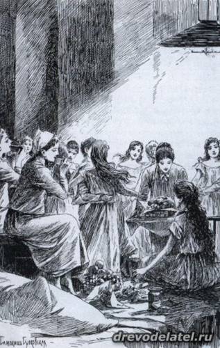 Устройство ёлки было другим развлечением. Маленькие довольствовались их устройством в дортуарах; большие в физической или рисовальной зале. Привозимое родными и купленное по записке классными дамами, пополненное складчиною от девочек всего отделения, шло на украшение ёлки; каждое отделение старалось богаче её украсить.