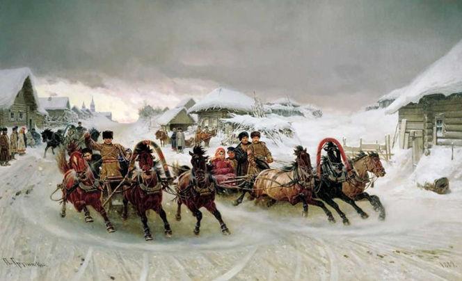 Катается особенно охотно: то там, то здесь из ворот вылетают тройки богачей с расписными, увитыми лентами дугами или выбегают простенькие дровни, переполненные подвыпившими мужиками и бабами, во всю мочь горланящими песни. От этих песен изнурённые, костлявые, но разукрашенные ленточками и медными бляхами крестьянские лошадёнки дрожат всем телом и, под ударами захмелевших хозяев, мчатся во весь дух вдоль деревенской улицы, разгоняя испуганные толпы гуляющих.