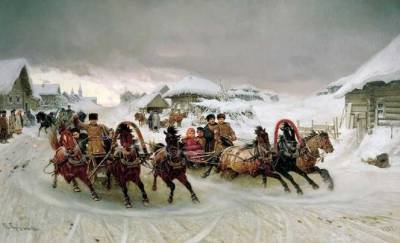 Но всех больше катаются «новожёны», т. е. молодые супруги, обвенчавшиеся в предшествовавший мясоед, так как обычай налагает на них как бы обязанность выезжать в люди и отдавать визиты всем, кто пировал у них на свадьбе.