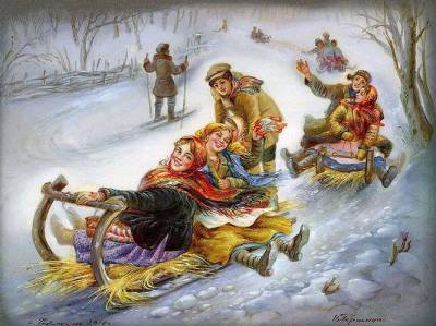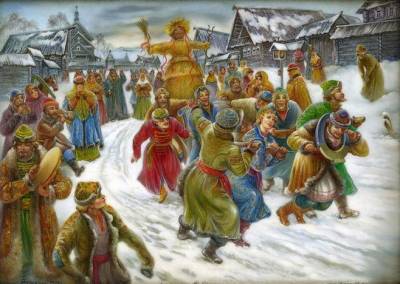Мы употребляем это слово, конечно, не в том смысле, какой придаётся ему в Италии или во Франции, хотя западноевропейский карнавал, с его заразительным, ликующим весельем, с его разряженной смеющейся толпой, оживлённо парадирующей в уличных процессиях, имеется и у нас, — только, разумеется, условия нашего климата и особенности деревенского быта не позволяют этому празднику принять характер того пышного торжества, какое мы наблюдаем у народов Запада.