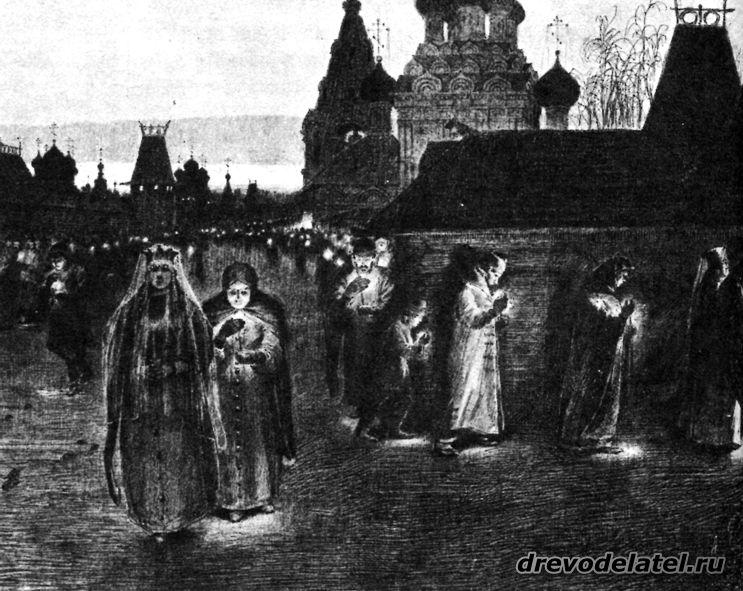 Оканчивался Великий пост в старой Москве дивными службами Страстной недели. Если и в наше время эти службы вызывают искренний восторг и умиление, то что сказать о том времени, времени процветания наших церковных обрядов, времени величественных и великолепных торжеств при участии обоих высочайших представителей власти духовной и мирской!