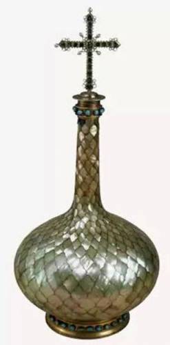 На особой деревянной горке размещаются все составы мира, а на верху её, особый священный сосуд, медный узкогорлый, покрытый перламутровою чешуёю, называемый алавастром. По преданию, алавастр прислан из Константинополя со св. миром в первые века христианства на Руси и вместе со всероссийской митрополией перенесён из Киева в Москву. В нём в неприкосновенности хранится преждеосвященное миро, которое таким образом никогда не иссякает на Руси.