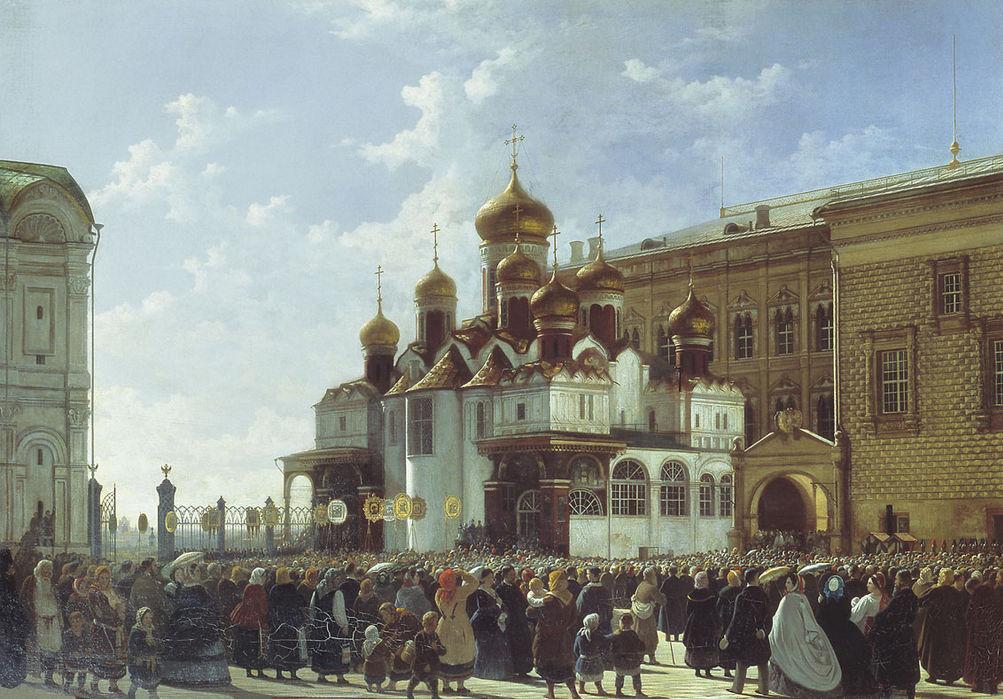 Шествие, обогнув церковь, подходит к закрытым дверям храма. Священнослужители, взойдя на ступени перед дверями, обращаются лицом к молящимся. Стихает пение и колокольный звон.