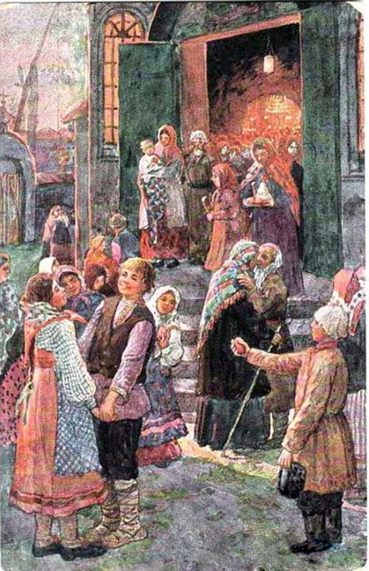 С вечера же пришедший из дальних окрестных деревень народ, заранее в ожидании праздника расположившийся в храме и около него или в соседних домах, встрепенётся и оживится, и дремавшие дотоле быстро воспрянут и наполнят храм.