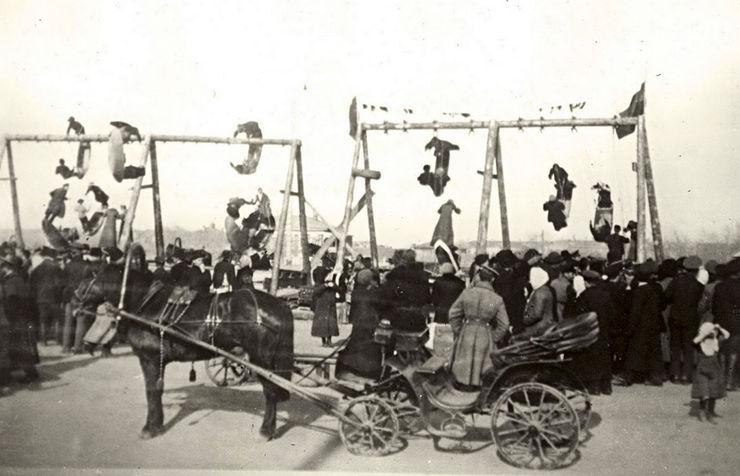 «...На качелях катаются решительно все», возле них «образуется нечто вроде деревенского клуба: девушки с подсолнухами, бабы с ребятишками, мужики и парни с гармониками и «тальянками» толпятся здесь с утра до ночи; одни только глядят да любуются на чужое веселье, другие веселятся сами. Первенствующую роль занимают здесь, разумеется, девушки, которые без устали катаются с парнями».