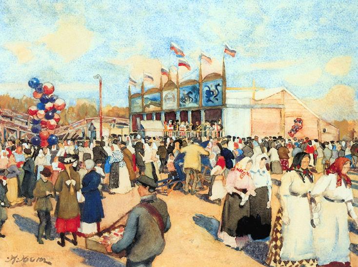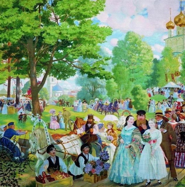 В конце прошедшего века и по Москве ещё носили березки, разукрашенные лентами, разными яркими лоскутками и красными платками, с песнями, бубнами, с балалайками и с прочими громкими, ухо режущими простонародными музыкальными орудиями; почти у каждого дома и на дворе стояла берёзка, оттеняющая стол с яствами и питьём.