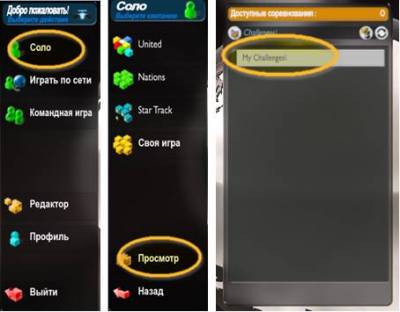 Найденные и скачанные трассы нужно разархивировать либо выложить в папку Мои документы\;TrackMania\;Tracks\;Challenges\;My Challenges. После этого открываем игру и жмём на «Соло» — «Просмотр» — в открывшемся окошке жмём на «My Challenges» — и любуемся раскрывшимся списком трасс на тысячи страниц, выбираем трэк и жмём на «Играть».