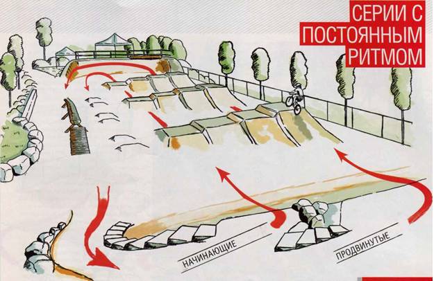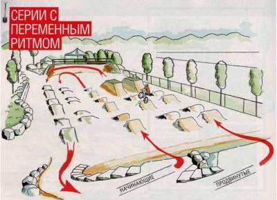 Секции для начинающих или просто для разминки должны иметь не менее шести-восьми повторений при одном ритмическом рисунке (то есть не менее шести-восьми верблюдов в секции). Начинай с невысоких кочек 40-50 см, шириной 1,5-2 м и расстоянием между вершинами 2,5 м, а расстояние между верблюдами должно быть не меньше 4- 4,5 м. Многие бывалые дёртеры скажут, что это слишком мелко, но попробуй пройти секцию из восьми кочек, расположенных друг от друга на одинаковом расстоянии. Этот не прекращающийся ритмический рисунок заставит тебя всерьёз попариться. После такой серии можно сделать поворот на 180 градусов и направить трамплины в обратную сторону с высотой кочек 50 см, той же ширины и расстоянием между вершинами 3-3,5 м. Расстояние между парами тоже должно увеличиться и составить 5-6 м. А вот количество кочек может остаться таким же.