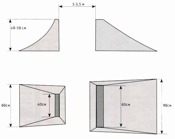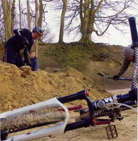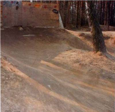 Распланировав приглянувшийся участок земли, разметив при помощи рулетки или просто колышков направления и серии, начинай методично, с чувством, с толком, с расстановкой (кстати, купи перчатки), снимать верхний слой почвы — дёрн — на 15-20 см. Сначала, непосредственно в ширину секции, примерно 1,5 метра, формируя тем самым будущее местоположение дёртов. Если после такой процедуры свободной земли окажется больше, чем ожидалось, эта земля может вполне пойти на столы побольше. При этом ширина верхушек трамплинов не должна быть менее 1,5 м, а ширина приземлений, в некоторых случаях, ещё больше. Помни, что боковые стенки трамплинов не должны быть круче 30 градусов. Это тот градус, который гарантирует сохранение параметров твоего сооружения, не давая краям осыпаться. Построив первую ритм-секцию, протестируй её, посмотри, хватит ли скорости для второго участка после прохождения виража. Вираж должен быть не очень крутым, чтобы была возможность подкрутить и набрать необходимую скорость для прохождения следующей секции. Не разрушай уже построенное творение, даже если, по твоему мнению, ты и твои друзья выросли из него. Чем будет больше вариантов прохождения, тем интереснее и разнообразнее будет ваше катание. Мелкие секции могут пригодиться как начинающим, так и реабилитированным по разным причинам раздолбаям. То есть тебе, или твоему приятелю, или просто в качестве разминки перед ответственной серией.