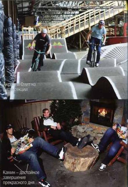 В нескольких местах трасса поднималась над полом, это было сделано по двум причинам - чтобы избежать перегрузки и создать подъёмы со спусками. Разогревшись, мы переместились на парковые фигуры, расположенные по периметру здания. В одну линию здесь оказалось выстроено столько всего, что и за один день не обкатать. Если хорошенько вкрутить в первом повороте, то можно пройти высоко по контруклону и отпрыгать целую серию накатом. Прямые прыжки перемежаются с уоллрайдами и трансферами, и все фигуры - чистое удовольствие. Кататься за Леноски, Акриггом и Смитом было здорово - парни выдавали трюк за трюком в каждом прыжке. Барспины, тейлвипы, 360 - и всё это прямо у меня перед носом. После короткого перерыва и миниконтеста на ритм-секции, мы отправились в зону норт-шора.