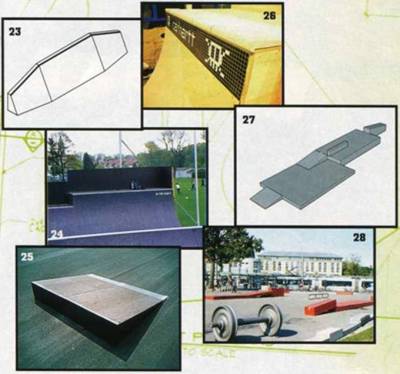 28) Урбан элеменс (urban elements): Новое поколение оборудования, которое отливается из железобетона. Фактически, это усовершенствованные уличные постройки. Такой тип оборудования ставится в черте города на спотах, тем самым уменьшая городской вандализм. Урбан элеменс универсальны и долговечны, что позволяет использовать и на открытых, и на закрытых площадках.