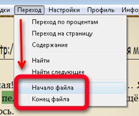 Ещё можно мгновенно перейти в начало либо конец книги по командам «Переход», затем «Начало файла» либо «Конец файла».